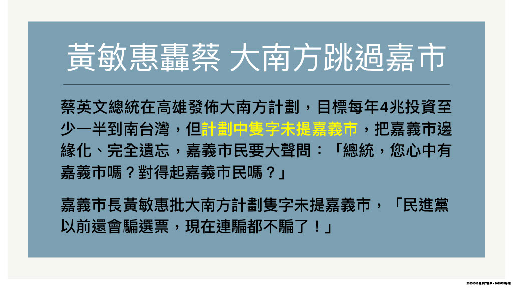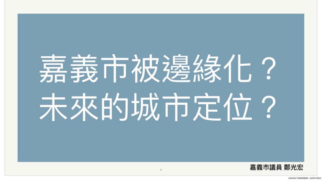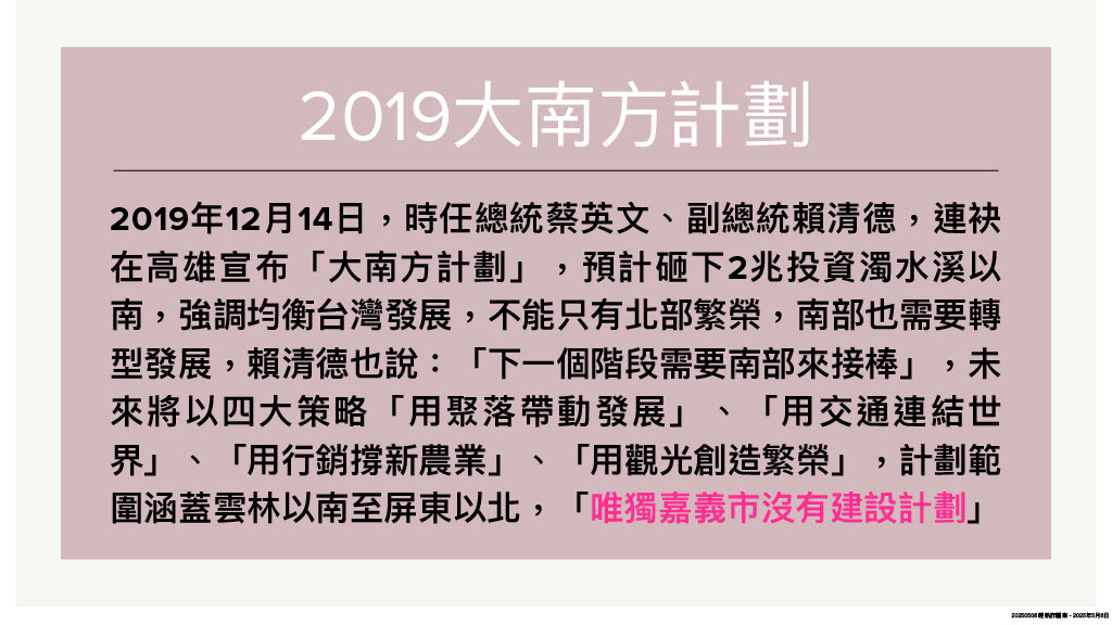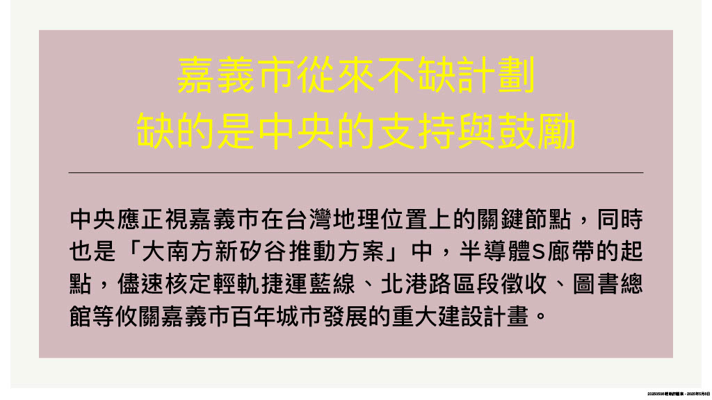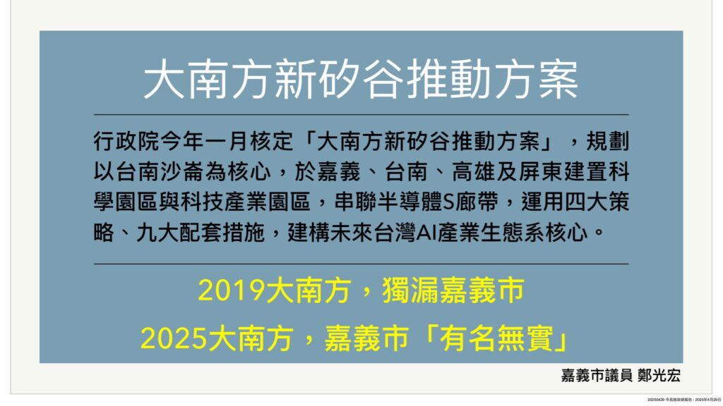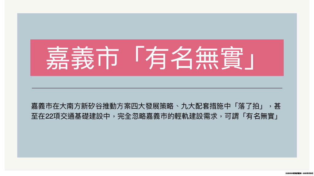 除了縣市間的城際競爭,嘉市還要面對中央「大小眼」,繼2019年蔡英文總統首度公布大南方計劃獨漏嘉義市後,今年(114)初行政院核定「大南方新矽谷推動方案」,嘉義市同樣在四大發展策略、九大配套措施中「落了拍」,甚至在22項交通基礎建設中,完全忽略嘉義市的輕軌建設需求,可謂「有名無實」。