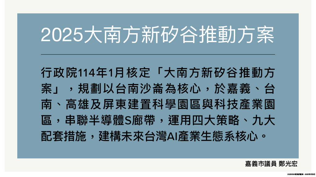面對縣市間激烈城際競爭、中央「厚此薄彼」,大南方新矽谷推動方案刻意忽略嘉義市位處半導體S廊帶的關鍵節點,光宏昨(29)透過市長市政報告呼籲中央應儘速核定嘉義市輕軌藍線、北港路區段徵收等攸關嘉市百年城市發展的重大計劃。