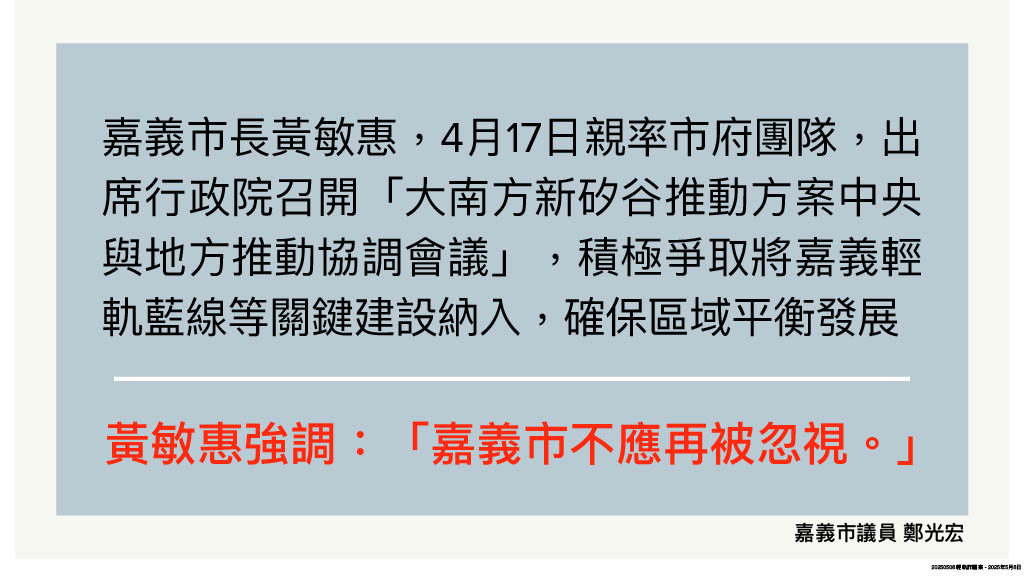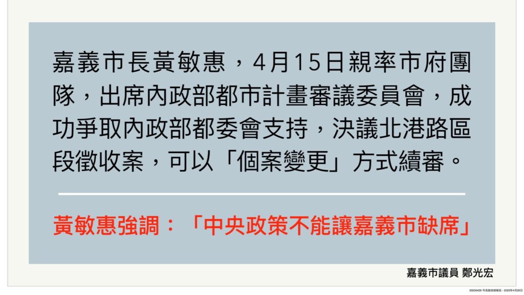 也因此市長黃敏惠才會在4月17日親率市府團隊北上參與大南方新矽谷推動方案中央與地方協調會議,力爭嘉義市的開發需求與建設。此外,4月15日黃敏惠也在十六年市長任期內,第二度列席內政部都委會,成功爭取北港路區段徵收以「個案變更」方式續審,加速推動與發展。