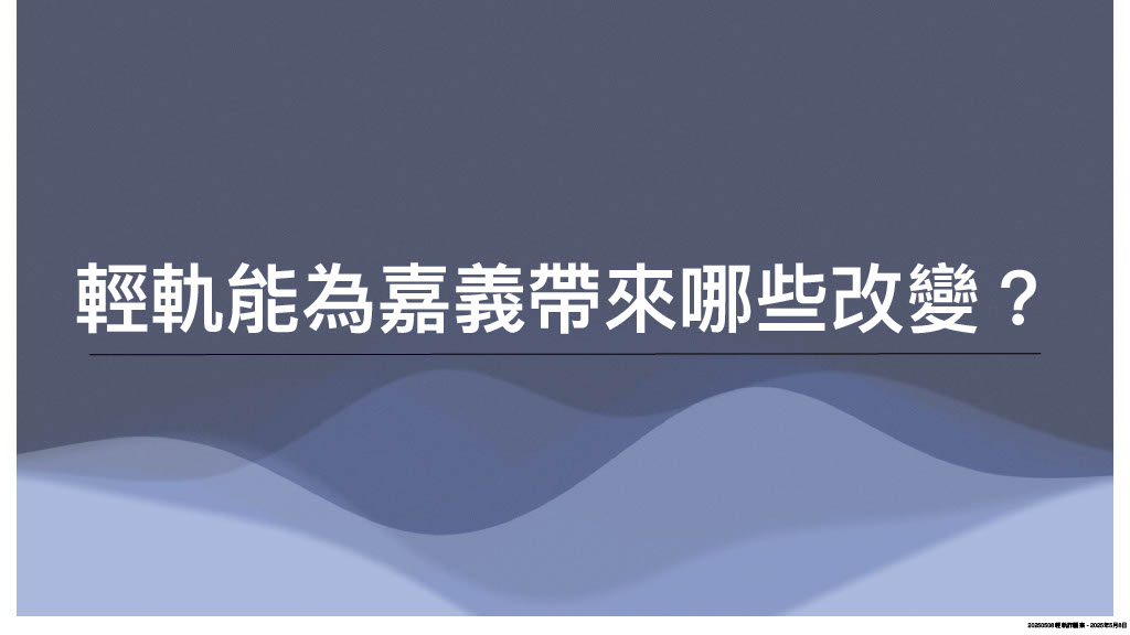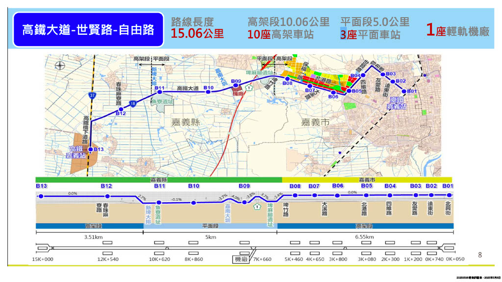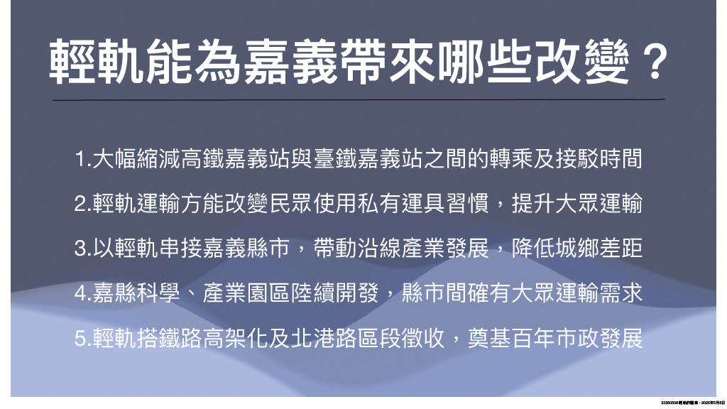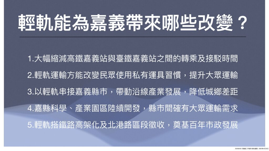 此外,輕軌還能串接嘉義縣市,透過站點帶動沿線發展,均衡城鄉差距,未來嘉縣科學、產業園區啟用後,也能解決通勤需求,更重要的是,輕軌未來如能搭配並串聯嘉義市鐵路高架化及站區開發、北港路區段徵收等重大建設,將奠基嘉義市百年市政發展。