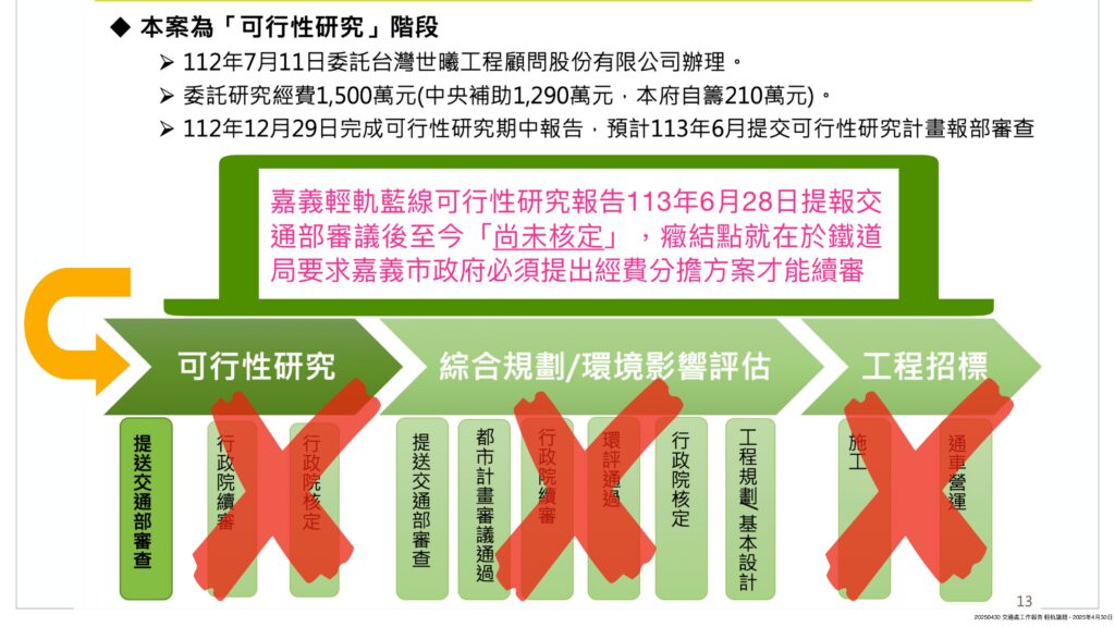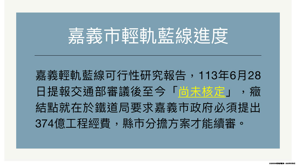 嘉義市輕軌捷運藍線可行性研究報告目前正在交通部審議中,市府認為高達370億的工程款,中央應履行承諾全額負擔。交通部則回覆,嘉義市應該依據「大眾捷運系統建設及周邊土地開發計劃申請與審查作業要點」提出縣市政府經費分攤計劃,雙方僵持不下,擱置至今。