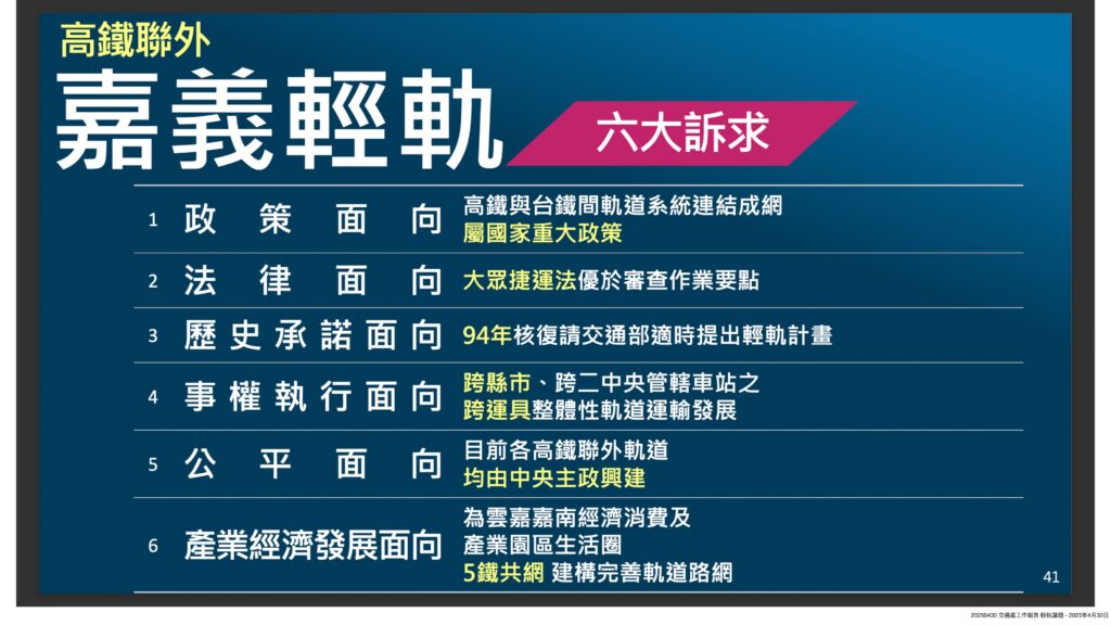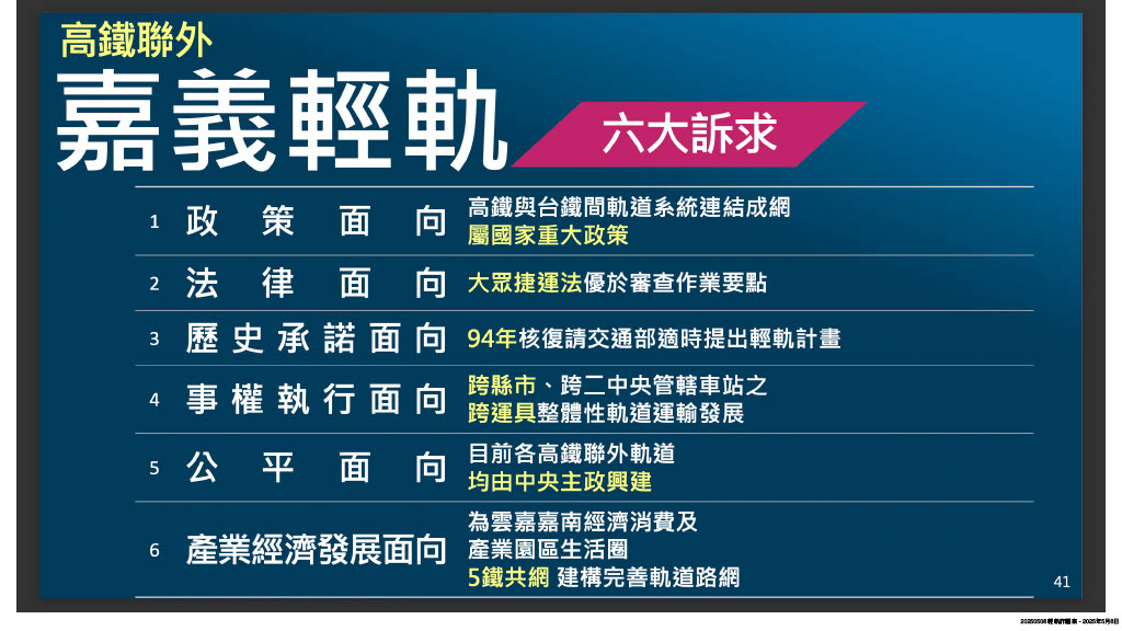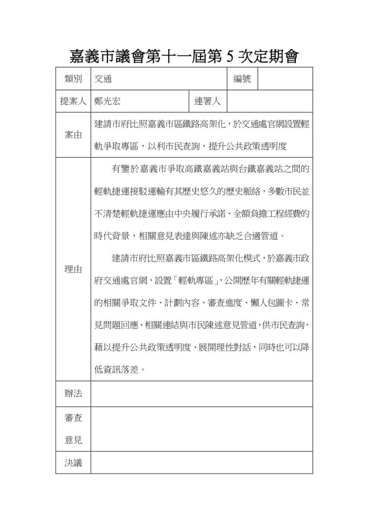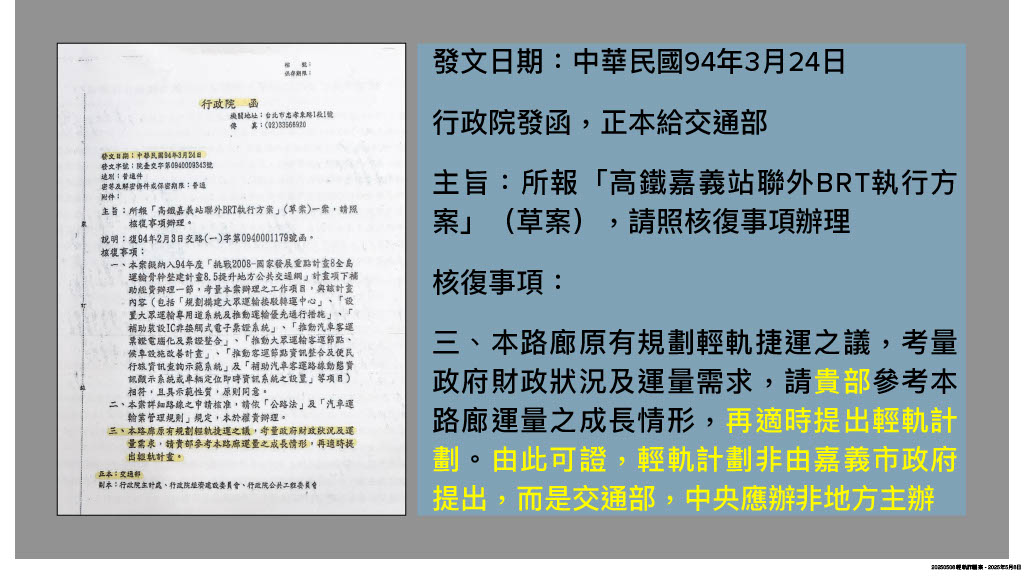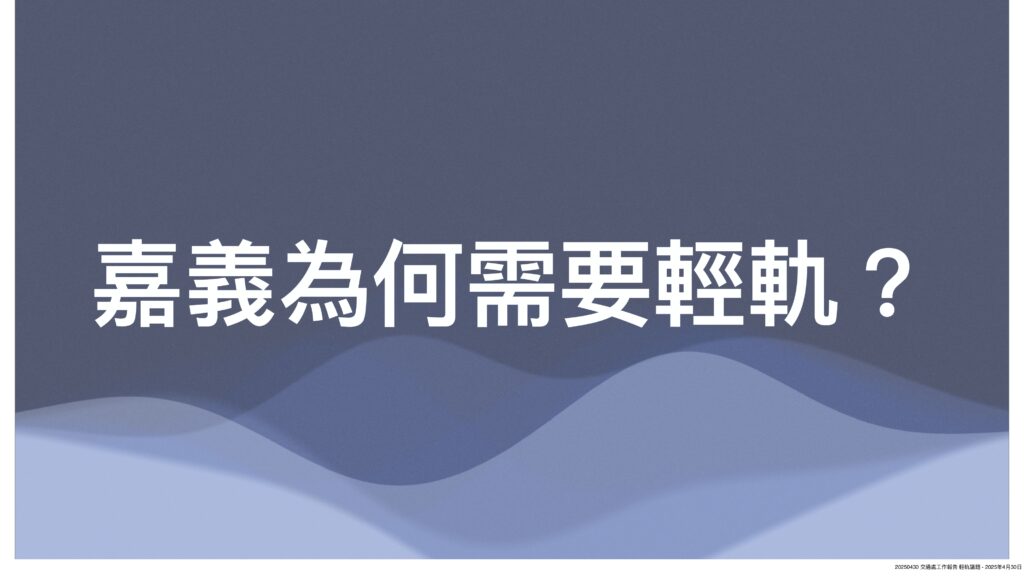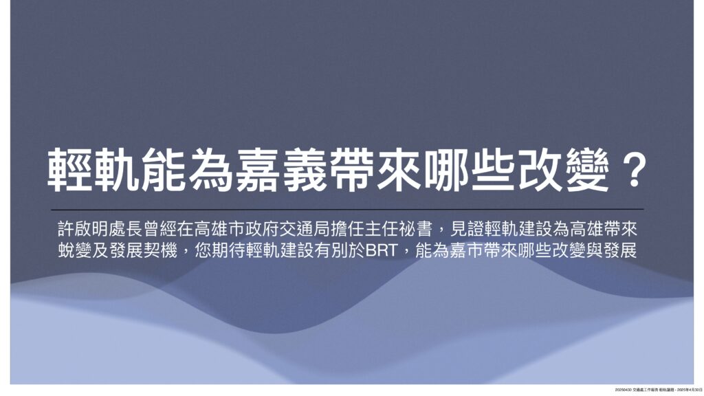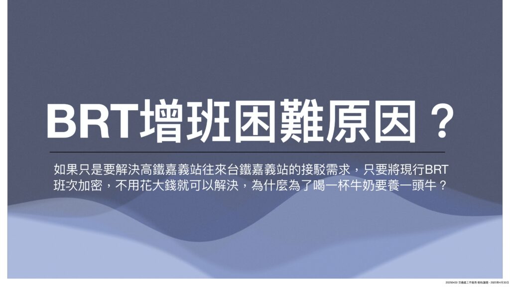 有鑒於今年初以來,市政府屢屢因輕軌經費分攤問題槓上中央,市長黃敏惠也認為中央背棄承諾,多次親率市府團隊北上溝通,惟針對市府熱呼呼的爭取態度,基層顯然認為370億輕軌建設僅為解決台鐵嘉義站與高鐵嘉義站間的接駁需求,顯不符經濟效益,為何不要求BRT增班,方能解決燃眉之急。