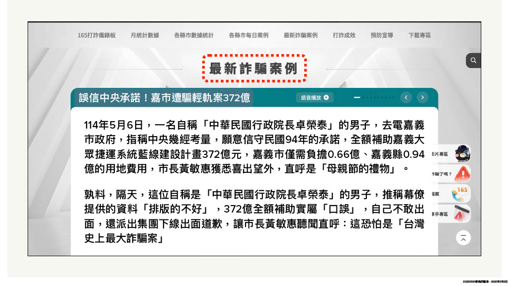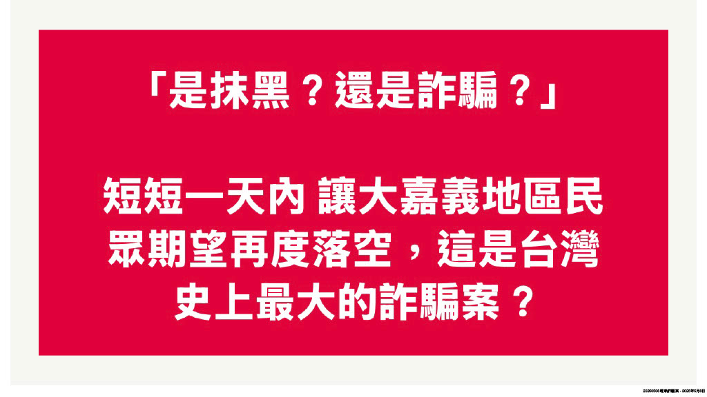 針對嘉義輕軌捷運藍線新建案,行政院長卓榮泰六日在立法院答詢時,明確提到「中央可以負擔372億」,市長七日記者會開心宣布:「這是最好的母親節禮物」,孰料不到兩小時,交通部長陳世凱馬上改口,為卓榮泰「口誤」道歉,黃敏惠聞訊詫異直呼:「這是台灣史上最大的詐騙案?」