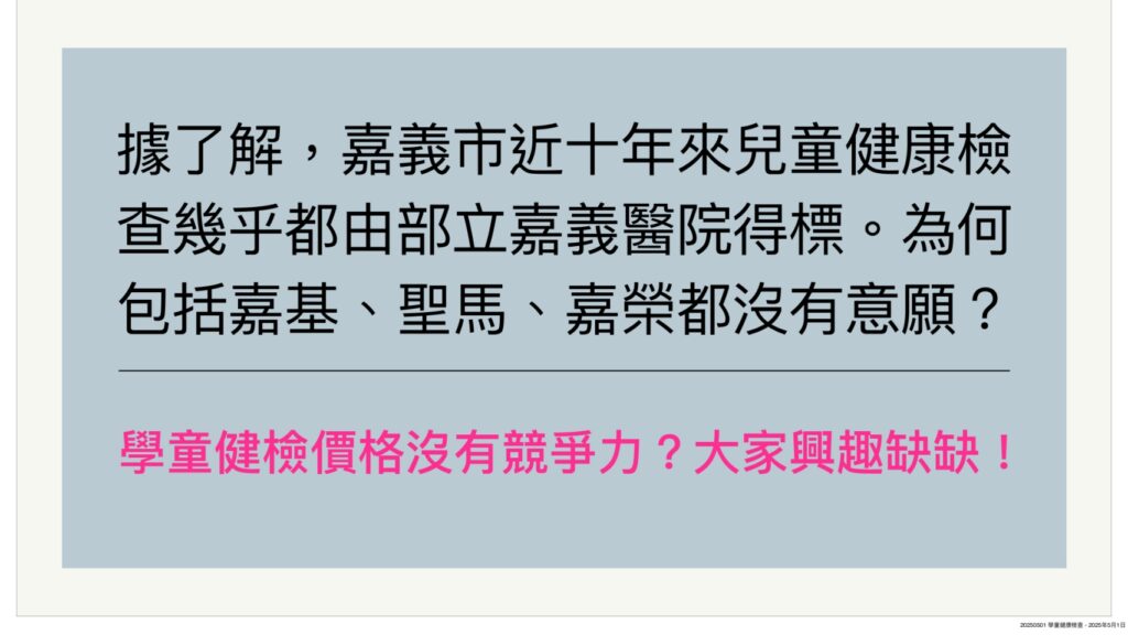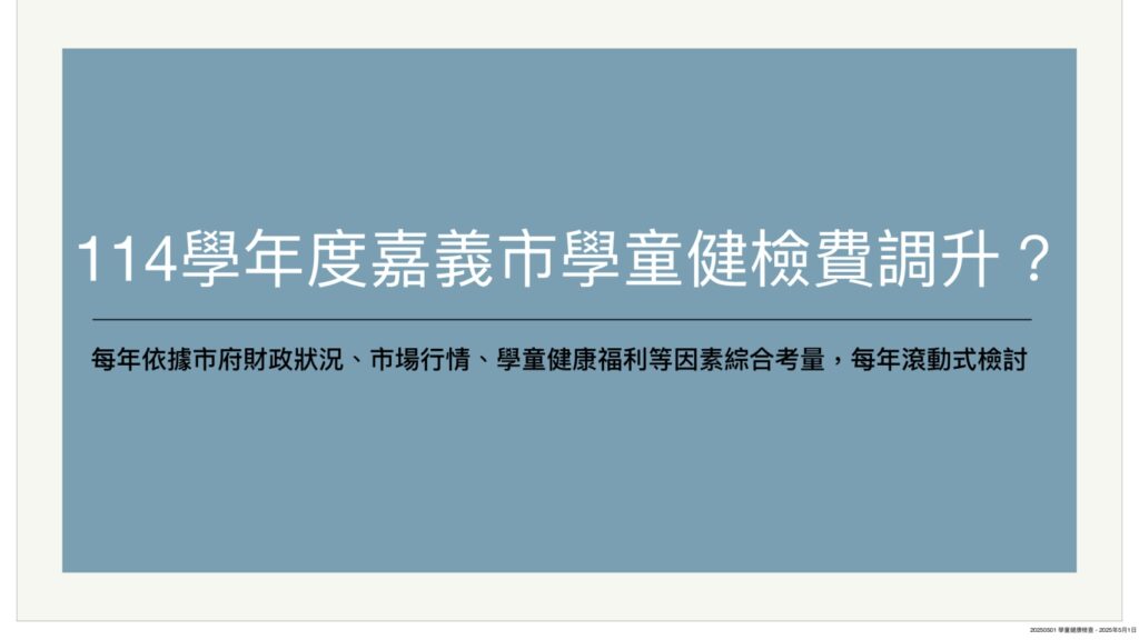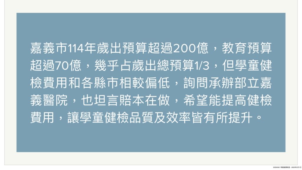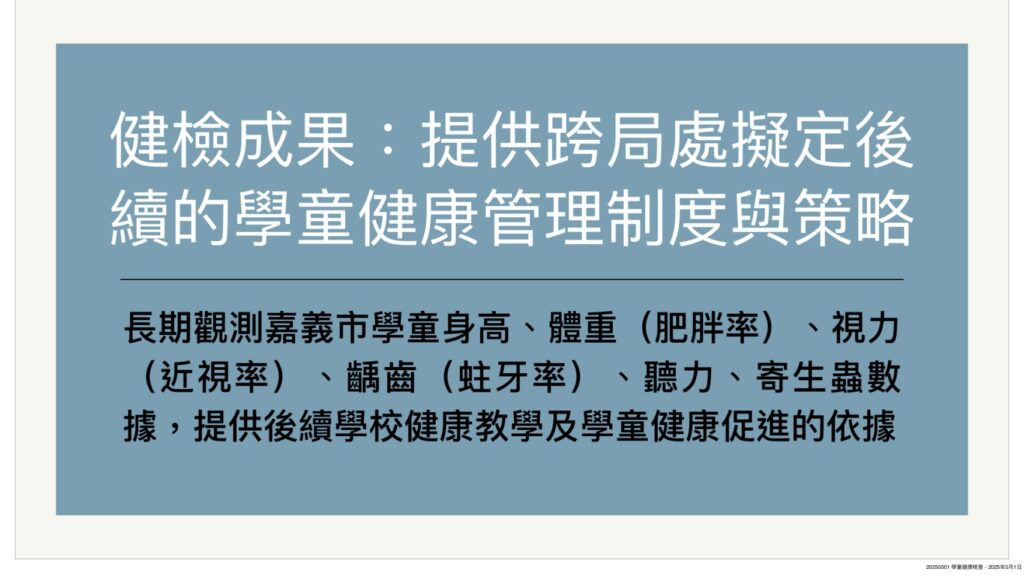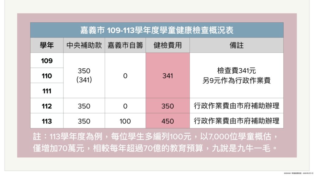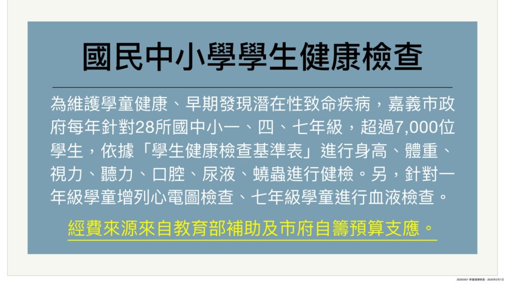 為維護學童健康、早期發現潛在性致命疾病,中央補助經費,地方視財政狀況加碼,共同推動學童健康計劃保健。民國109-111年,中央補助每人350元,112年除中央補助350元外,嘉市另編列行政作業費補助,113年中央補助350元,嘉市首度加碼補助每人多100元健檢費及行政作業費。
