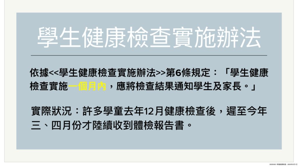 另,依據<<學生健康檢查實施辦法>>第6條規定:「學生健康檢查實施一個月內,應將檢查結果通知學生及家長。」惟有家長反應,許多學童去年12月完成健檢後,遲至今年三、四月份才陸續收到體檢報告書,憂心如有學童健檢異常將喪失治療先機。
