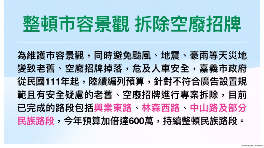 有鑒於市區街道招牌林立五花八門、雜亂的市容景觀也常為人所詬病,加上如遇颱風、地震、豪雨侵襲,空廢招牌屢屢變成街道上不定時公安炸彈,為此市府從111年起,每年固定編列300萬預算,針對民族路部分路段、興業東路、中山路、林森西路等,逐步拆除老舊及空廢招牌。