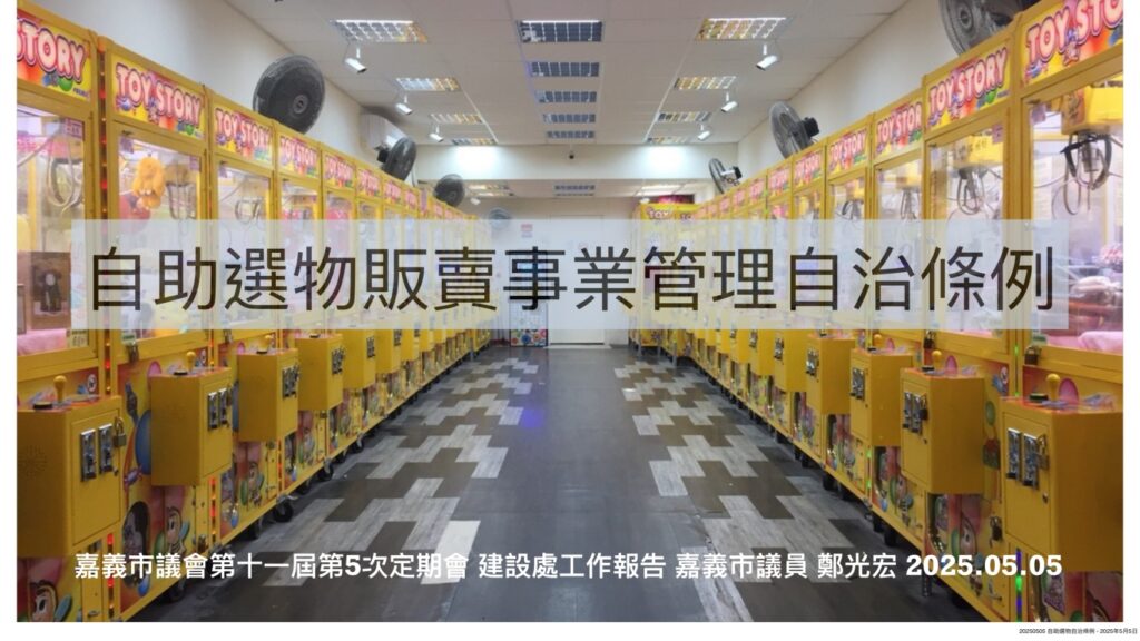 最後,礙於許多自助選物販賣營業場所常為24小時營業且無人在現場經營,因此光宏也建議嘉義市自治條例應該考量納入強制要求業者加裝監視器,以維買賣雙方交易之透明及權益