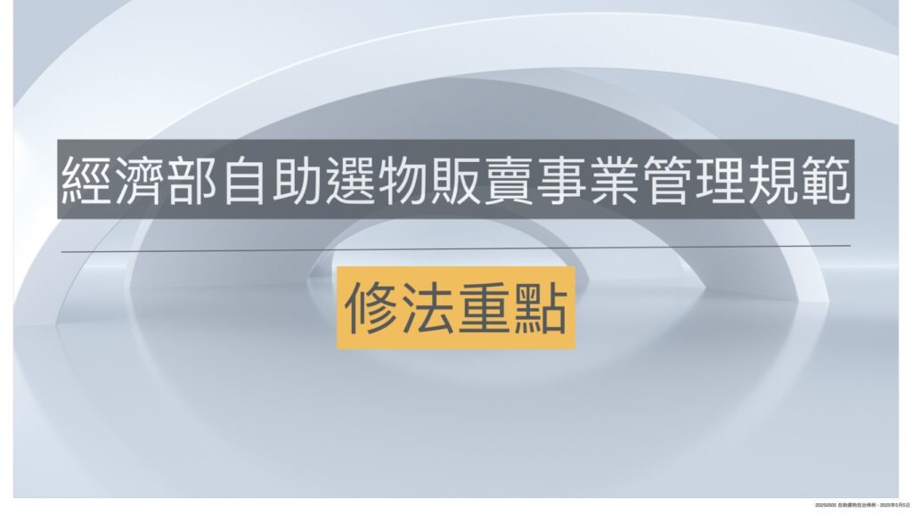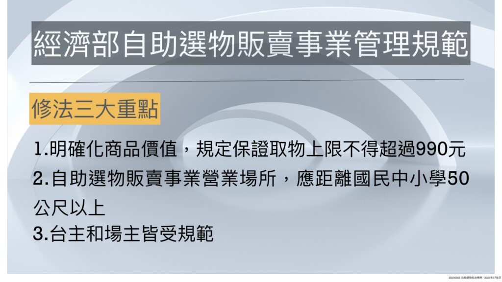 因應自助選物販賣業者擅自改裝、任意設置、提供有害身心健康等問題層出不窮,加上地方政府反應稽查及管理上困難,經濟部113年10月14日公布「自助選物販賣事業管理規範」,提供各縣市依循並制定自治條例。修法重點主要是明確化商品價值且保證取物價值不得超過990元、限制營業場所與國中、小距離限制及場主與台主同受規範限制。