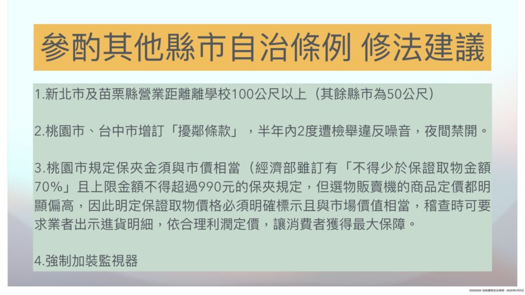 此外,光宏也建議,由於嘉義市幅員狹小,自助選物營業場所與國中、小距離限制,應考量比照新北市及苗栗縣,從50公尺提高到100公尺,以維護兒童身心健康。桃園市與台中市則另訂定「擾鄰條款」,業者如半年內遭兩度檢舉噪音,將祭出夜間停業處分。