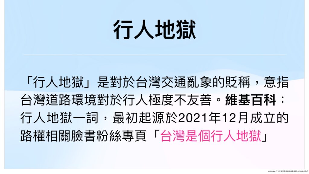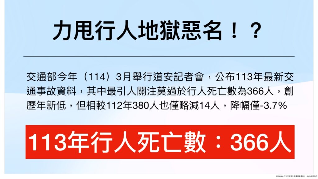 2023年以前,台灣每年行人交通事故死亡數都超過400人,外媒諷刺台灣交通亂象如「行人地獄」,也因此逼得中央全方位從交通工程、交通宣導及交通執法等三大面向著手宣導與取締,企圖力甩「行人地獄」污名。交通部三月公布113年交通事故資料,行人死亡下降為366人,創歷年新低,但離「行人零死亡」願景仍有待努力。