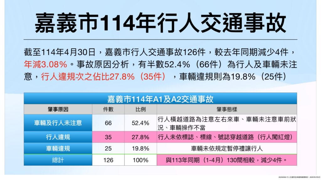 中央著手改善,地方努力宣導,截至今年四月,嘉義市行人交通事故共126件,較去年130件略減4件,年減3.08%,細究肇事原因,車輛及行人未注意左右來車與車前狀況66件(52.4%)、行人違規35件(27.8%)次之、車輛違規25件(19.8%)。