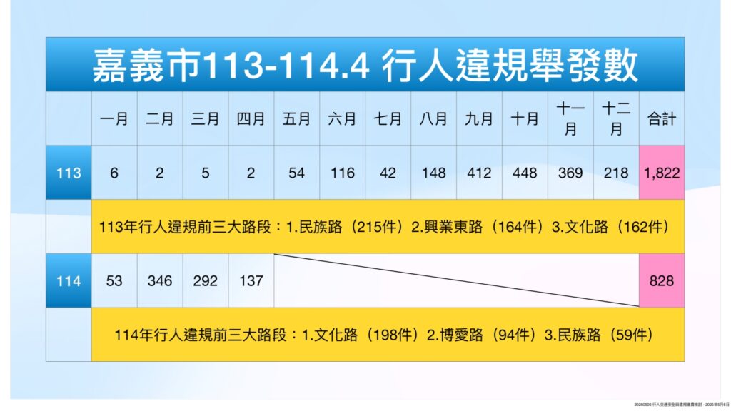 降低交通事故,除了行車要禮讓行人,行人也要遵守交通規則,為此市警局從去年五月就加強行人違規執法,截至今年四月,一年下來開單超過2,635件,市民違規前五大路段包括文化路360件、民族路274件、興業東路164件、中山路61件、博愛路94件,多位於市中心。