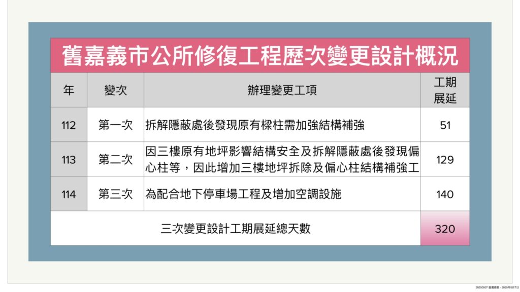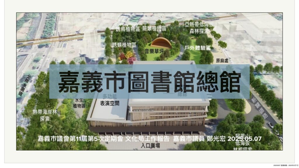 延宕許久嘉義市圖書總館新建案,因都市計劃用地變更,審議程序仍「卡關」在內政部都委會。歷史建築嘉義市舊市公所修復再利用案,也因歷經三次變更設計,無法如期在7月26日竣工,嘉義市議員光宏七日質詢文化局、財稅局,希冀加快腳步,讓市民享受重大市政建設果實。
