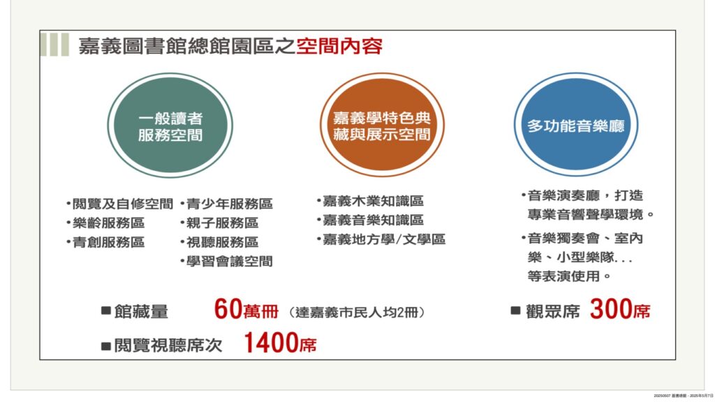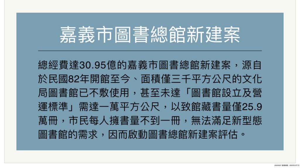 總經費達30.95億的嘉義市圖書總館新建案,源自於民國82年開館至今、面積僅三千平方公尺的文化局圖書館已不敷使用,甚至未達「圖書館設立及營運標準」需達一萬平方公尺,以致館藏書量僅25.9萬冊,市民每人擁書量不到一冊,無法滿足新型態圖書館的需求,因而啟動圖書總館新建案評估。