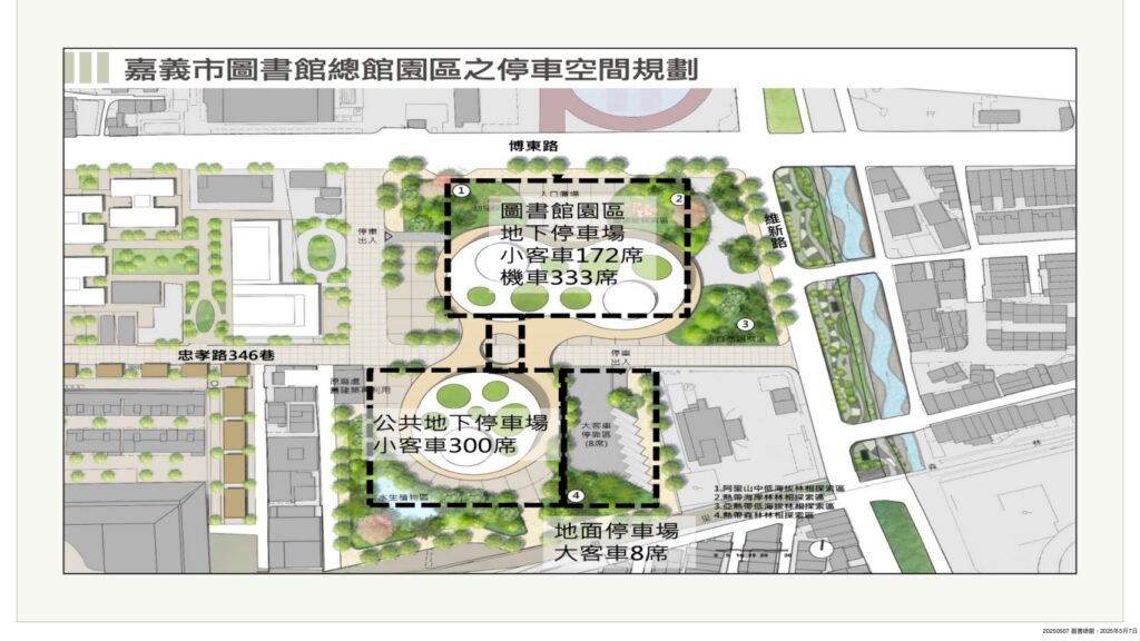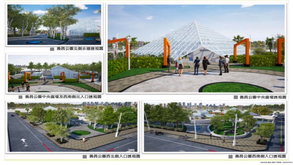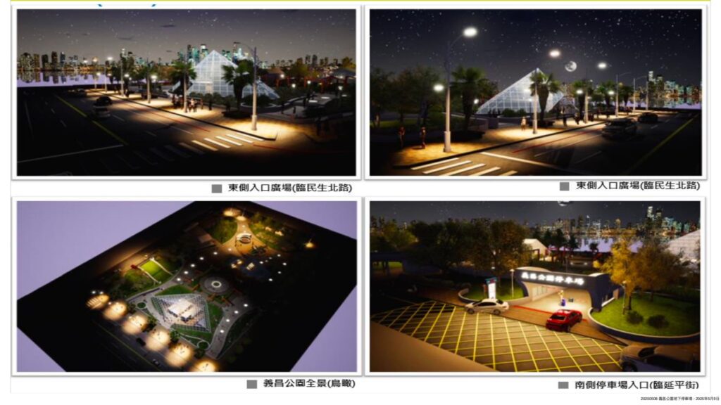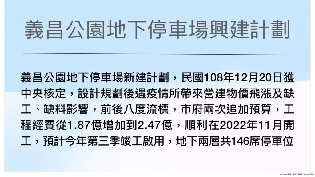 義昌公園地下停車場新建計劃,民國108年12月獲中央前瞻計畫核定,惟設計規劃後遇新冠疫情所帶來營建物價指數飛漲及缺工、缺料影響,前後八度流標,市府兩度追加預算,工程經費從1.87億增加到到2.47億,才順利在2022年11月開工,預計今年第三季啟用,地下兩層共146席停車位,可望紓解市中心緊繃停車需求。