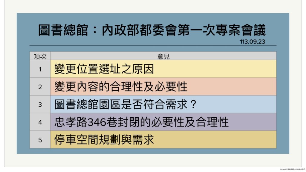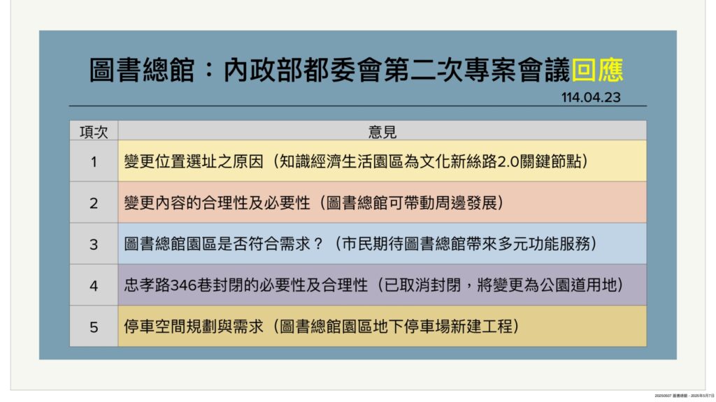 113年9月23日,專案小組第一次會議提出包括選址原因、變更社教用地的合理性與必要性、忠孝路346巷封閉的必要性及合理性與停車空間規劃與需求等意見,市府修正意見後,今年4月23日專案小組第二次會議,光宏質詢文化局長謝育哲進度為何?是否有信心可以在市長卸任前核定計劃、動工?