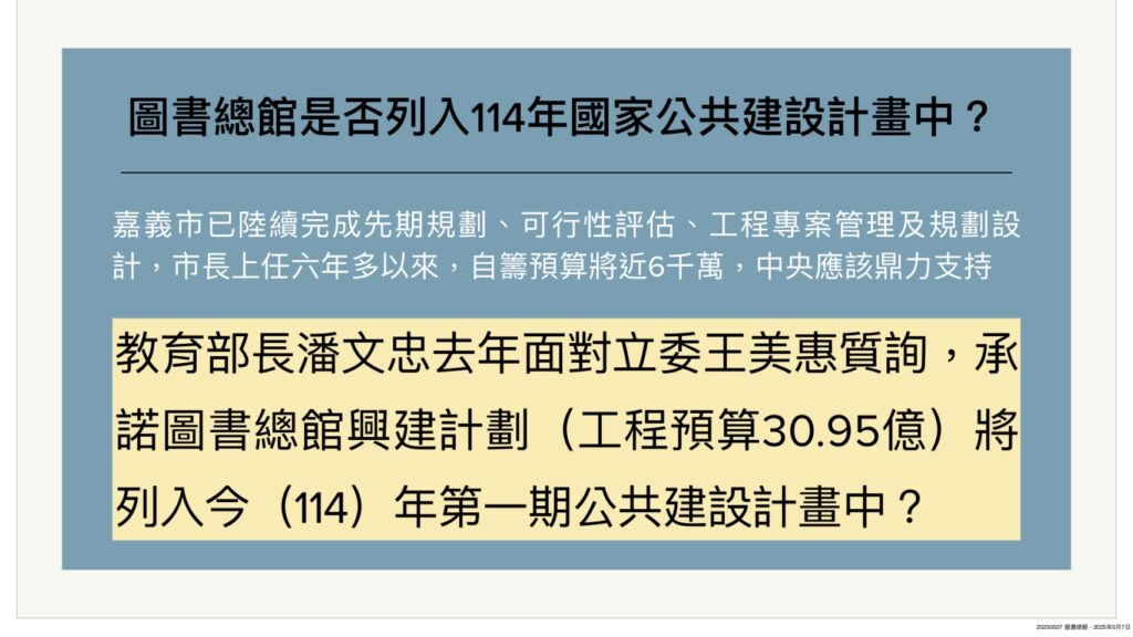 另外,由於教育部長潘文忠,去年三月面對立委王美惠質詢時,曾經承諾會將嘉義市圖書總館新建案,放入114年國家整體開發第一期公共建設計畫中,光宏也追問謝育哲,中央是否有履行承諾?