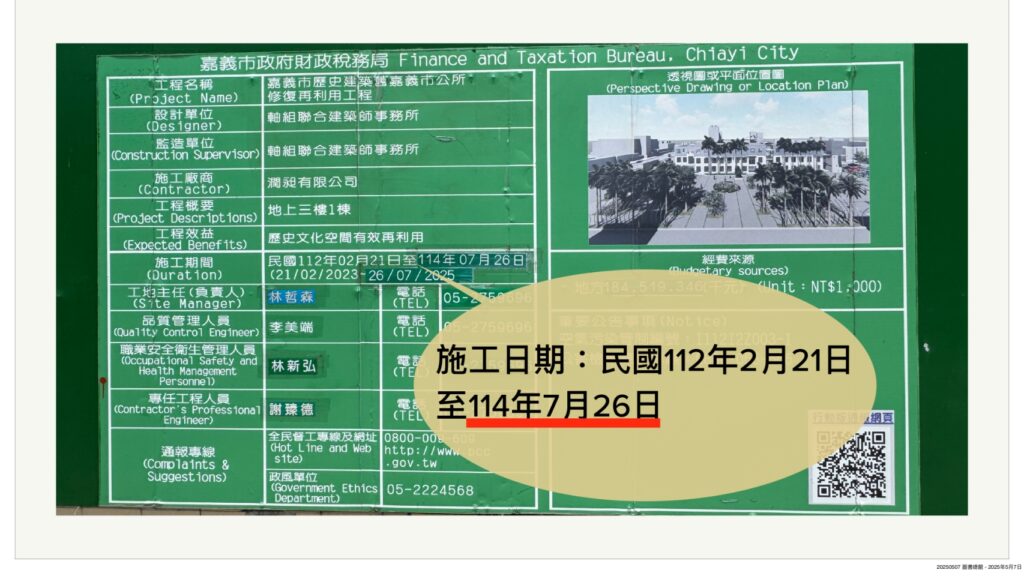 針對嘉義市歷史建築舊市公所修復再利用案,由於之前歷經三次變更設計,展延工期達320天,光宏也擔憂原訂七月廿六日的竣工時程勢必要往後延,詢問財稅局長洪彩燕,有沒有把握可以在今年底完工?讓後續的招商作業可以加速進行,讓市民可以儘早享受到重大市政建設完工所帶來甜美的果實。