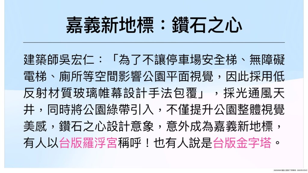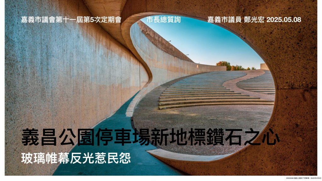 即將在今年第三季竣工啟用的義昌公園地下停車場,因外觀採玻璃帷幕設計,市民戲稱「台版羅浮宮」,惟四周住家反應,白天陽光照射在玻璃帷幕所造成反射光害要求改善,嘉義市議員光宏昨(九日)質詢,爭取受害住、店家可以加裝隔熱紙或窗簾降低民怨。