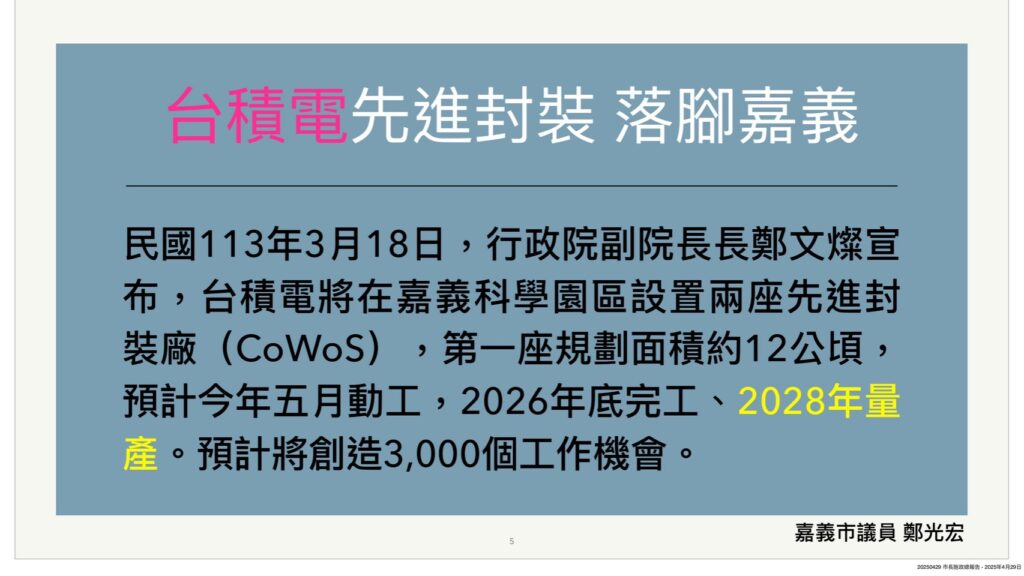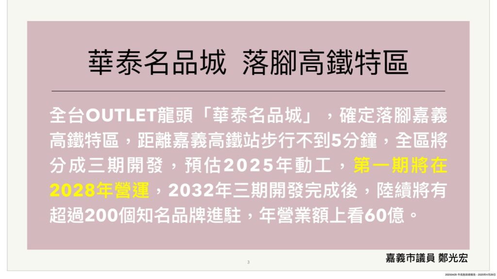 光宏表示,從去年(113)開始,先是全台outlet龍頭「華泰名品城」確定落腳嘉義高鐵特區,3月18日時任行政院副院長鄭文燦宣布台積電先進封裝廠(CoWos)也落腳嘉義科學園區,不免讓人憂心嘉義市將被邊緣化,也敦促市府構思未來的城市定位。