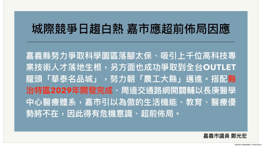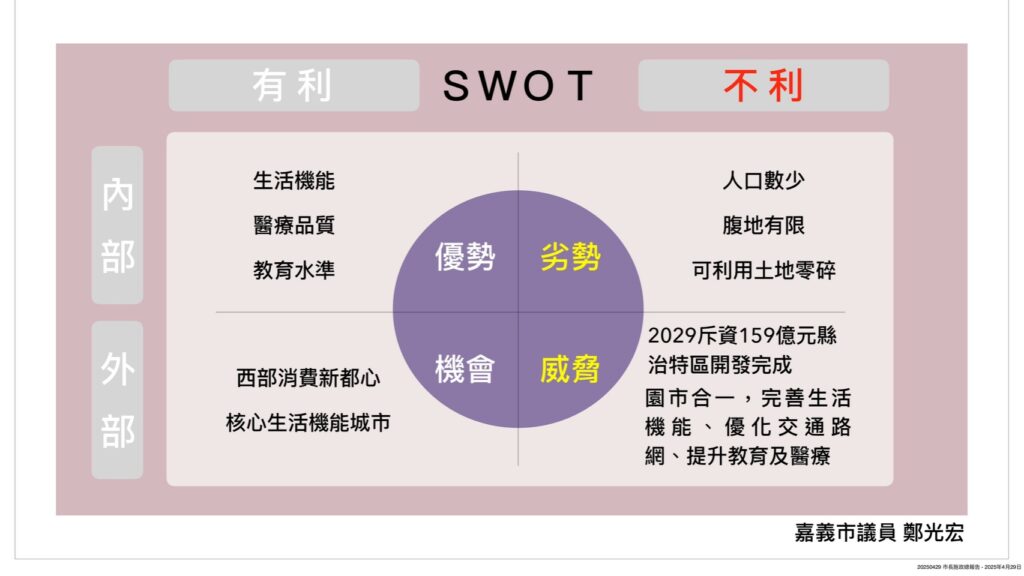 接著,光宏在去年底定期會市長市政報告中,近一步以SWOT分析嘉義縣市各自優、劣勢、機會及威脅,提醒市府要強化既有的生活機能、教育、醫療等競爭優勢,否則一旦嘉縣成功轉型農工大縣、科技園區相繼投產、縣治特區、園市合一陸續開發完成,嘉市競爭優勢將不在。