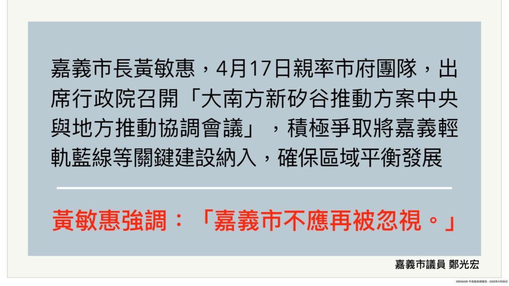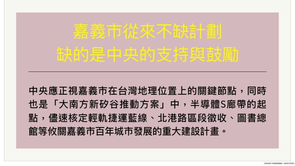 市長施政報告:盼中央宏觀均衡規劃 建設發展勿獨漏嘉市 -2025/04/29