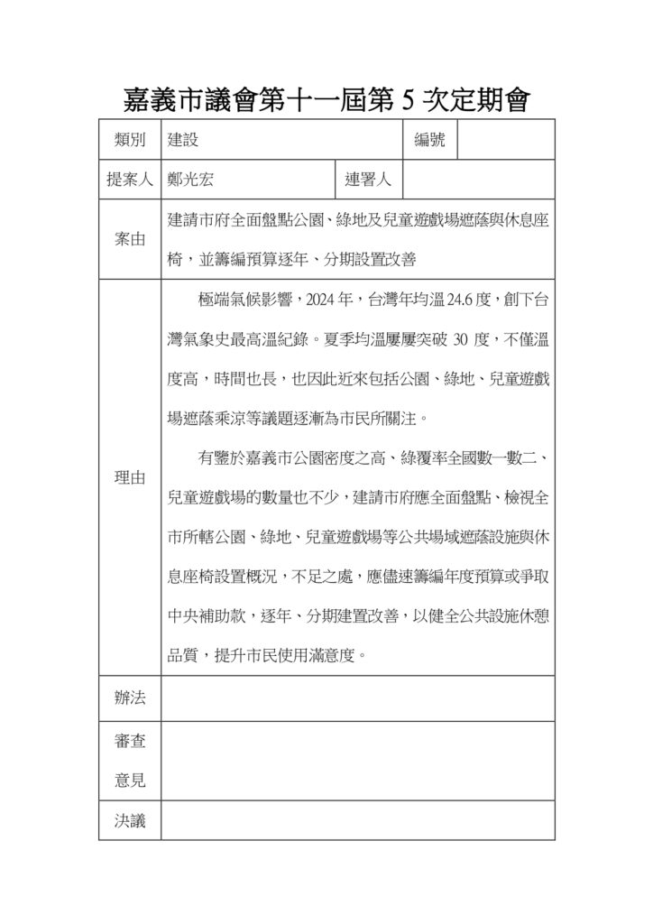 建請市府全面盤點公園、綠地、兒童遊戲場的遮蔭及休息座椅