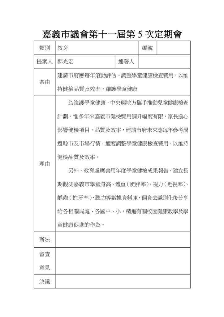 最後,光宏提醒學童健康檢查結束後,教育處應善用年度學童健檢成果報告,建立長期觀測嘉義市學童身高、體重(肥胖率)、視力(近視率)、齲齒(蛀牙率)、聽力等數據資料庫,去識別化後分享給各相關局處、各國中小,精進有關校園健康教學及學童健康促進的作為。