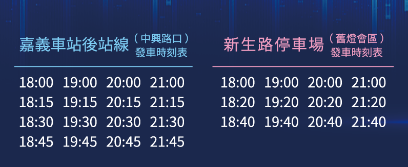 新生路停車場(舊燈會)線:18:00-22:00(約20分1班)
